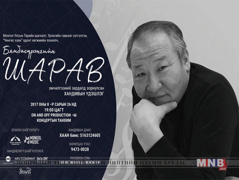 Монгол Улсын төрийн соёрхолт, урлагийн гавьяат зүтгэлтэн, хөгжмийн зохиолч Б.Шаравын эмчилгээний зардалд хандив цуглуулах зорилго бүхий “VIP” үдэшлэг энэ сарын 26-нд болно.