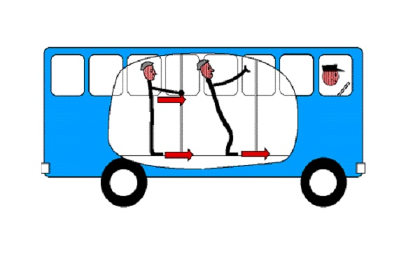 Автобус хөдлөх үед дотор нь зогсож байгаа зорчигчийн биеийг хойноос нь татах мэт хүч үйлчилдэг. Мөн тогтмол хурдтай хөдлөж байгаад хурдаа огцом сааруулах үед зорчигчид урагш татагдах мэт хүч үйлчилнэ. Цонхны хөшгийг хаах, хөдөлгүүрийн дуу чимээг тусгаарлах зэргээр гадна орчны тухай мэдээлэл авах боломжгүй тохиолдолд тогтмол хурдаар хөдлөж буй автобусны зорчигч автобус хөдлөж байгаа эсэхийг мэдэрч чадахгүй.