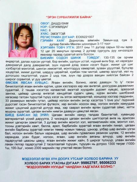 Дорноговь аймгийн Замын-Үүд суманд оршин суух хаягтай Д.Сэржмядаг гэх, 8 настай, охин 2017 оны 11 дүгээр сарын 02-ны өдрийн 12 цагийн орчимд гэрээсээ гарч яваад одоог хүртэл сураггүй алга болсон хэргийг шалгаж байна.