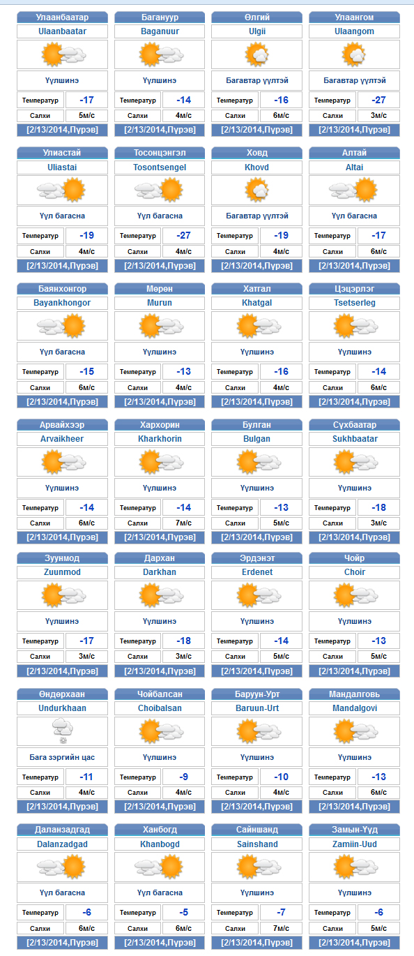 | Өнөөдрийн цаг агаарын мэдээ /2014.02.14/ | ||