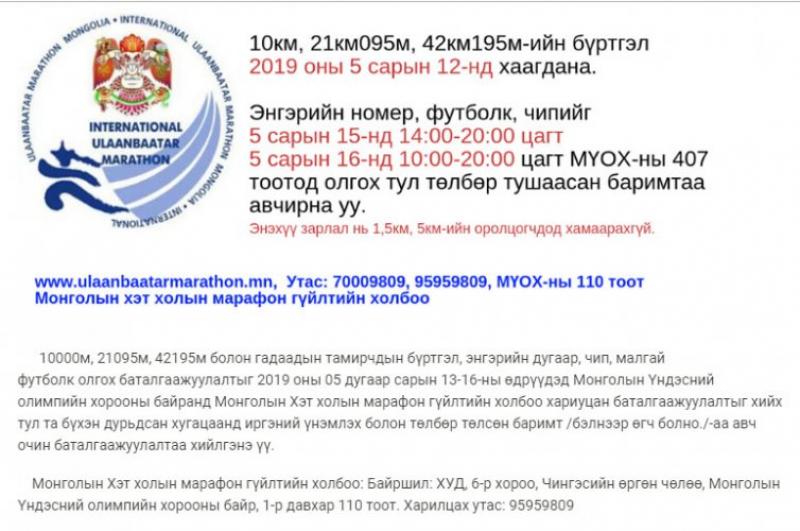 Уламжлалт гүйлтийн тэмцээн өсвөр үе, залуучууд, насанд хүрэгчид болон гэр бүл, тэргэнцэртэй иргэдийн дунд болох бөгөөд бүртгэлийг http://ub-marathon.ub.gov.mn/ сайтаар авч байна.