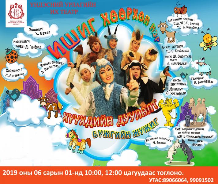 Х.Батаагийн зохиол, төрийн шагналт, урлагийн гавьяат зүтгэлтэн Г.Бирваа, төрийн шагналт Б.Мөнхболд нарын хөгжим "Ишиг хөөрхөн нэр" дуулалт бүжгийн жүжиг тайзнаа “амилах”-аар болжээ. .