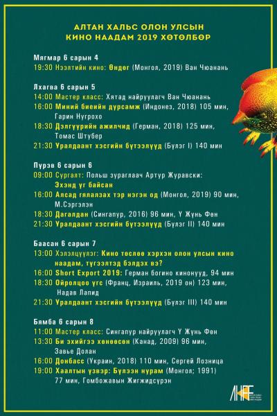 Дашрамд дуулгахад, наадмын хүрээнд БНХАУ-ын найруулагч Ван Чюананий сургалт, хэлэлцүүлэг болохоос гадна наадмын дөрөв дэх өдөр “Кино төслөө хэрхэн олон улсын кино наадам, түгээлтэд бэлдэх вэ?” сэдэвт сургалт зохион байгуулагдана. Цаашлаад тус наадмын хүндэт зочин Сингапурын найруулагч Ү Жүнь Фөний мастер класс зохиогдох бөгөөд нийтдээ гурван удаагийн томоохон сургалт үнэ төлбөргүй явагдах аж.