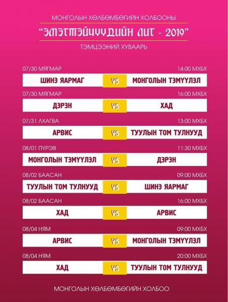 Харин 2019 оны Эмэгтэйчүүдийн лигийн тоглолтууд МХБХ-ны ногоон талбайд үргэлжлэн явагдсаар байна. Тухайлбал, өнөөдөр “Шинэ яармаг” болон “Монголын тэмүүлэл” тоглох бол “Дэрэн” багийн эсрэг “Хад” гэсэн хоёр тоглолт болох юм.