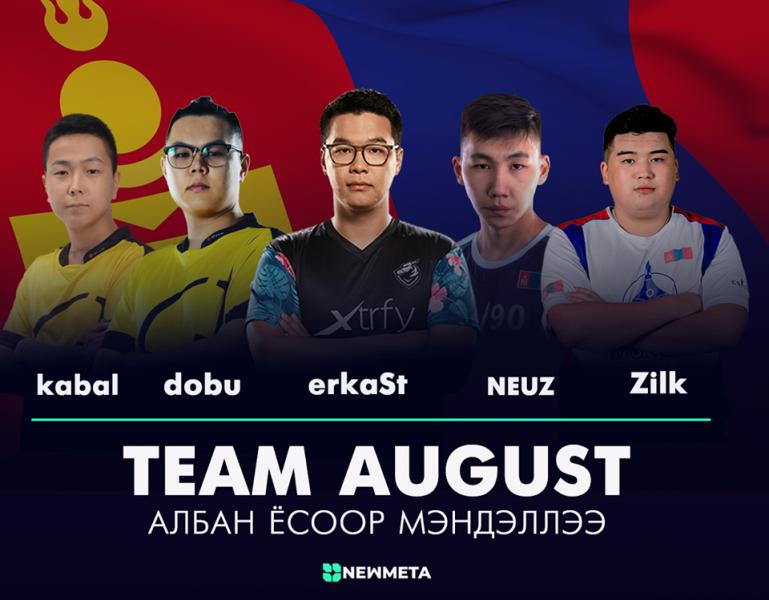 Тус багийн албан ёсны бүрэлдэхүүн "erkaSt" Г.Эрдэнэцогт болон “Kabal”, "dobu", “Zilkenberg” “NEUZ” нэрээр тоглодог монгол тоглогч багтсан юм. “August” багийн гишүүд бүгд хилийн чанадад гадны багт мэргэжлийн тоглогчийн гэрээгээр тоглож байсан туршлагатай тамирчин бөгөөд олон улсын тэмцээнд амжилт үзүүлж байсан.