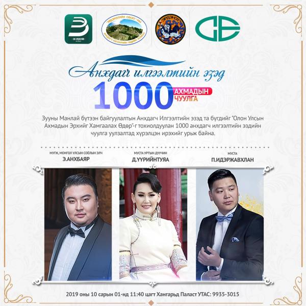 “Энх Эрдэнэтийн хөгжил” төрийн бус байгууллага, Орхон аймгийн Засаг даргын Тамгын газар, Эрдэнэт үйлдвэр ТӨҮГ, “Эрдэнэтийн овооны анхдагч илгээлтийн эздийн холбоо” ТББ хамтран “1000 анхдагч илгээлтийн эздийн чуулга” уулзалтыг ирэх сарын 1-нд буюу Ахмадын баярын өдөр 11:40 цагт Орхон аймгийн “Хангарьд” паласт зохион байгуулна.