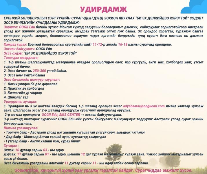 Австрали улсын Сидней хотод төвтэй “Oogii edu”-н хамт олон ерөнхий боловсролын сургуулийн 11-12 дугаар ангийнхан буюу 16-18 насны сурагчдын дунд “Би эх дэлхийдээ хэрэгтэй” сэдэвт эссэ бичлэгийн уралдаан зарлажээ. Монгол хүүхэд, залуусын боловсролыг дэмжих, сайжруулах болоод хүрээлэн буй орчиндоо өөрийн мэдлэг, боловсролоо зориулах