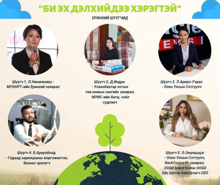 Мөн “Би эх дэлхийдээ хэрэгтэй” сэдэвт эссэ бичлэгийн уралдаанд ирсэн материалыг Монголын үндэсний олон нийтийн радио, телевизийн Ерөнхий захирал Л.Нинжжамц, Олон улсын сэтгүүлч, “RackCorp”-н пи ар захирал, Oogii брэнд болон “Oogii edu”-н үүсгэн байгуулагч, CEO О.Оюунцэцэг Улаанбаатар хотын төв номын сангийн захирал, МУИС-ийн багш, соёл судлаач Д.Индра, Олон улсын сэтгүүлч Л.Ариун-Учрал, Гадаад харилцааны мэргэжилтэн, бизнес эрхлэгч Б.Ариунболд нар шүүх аж.