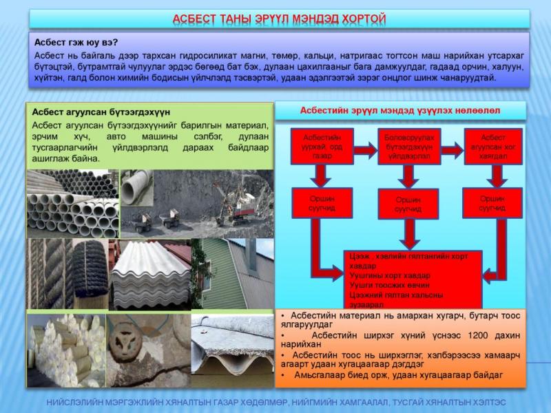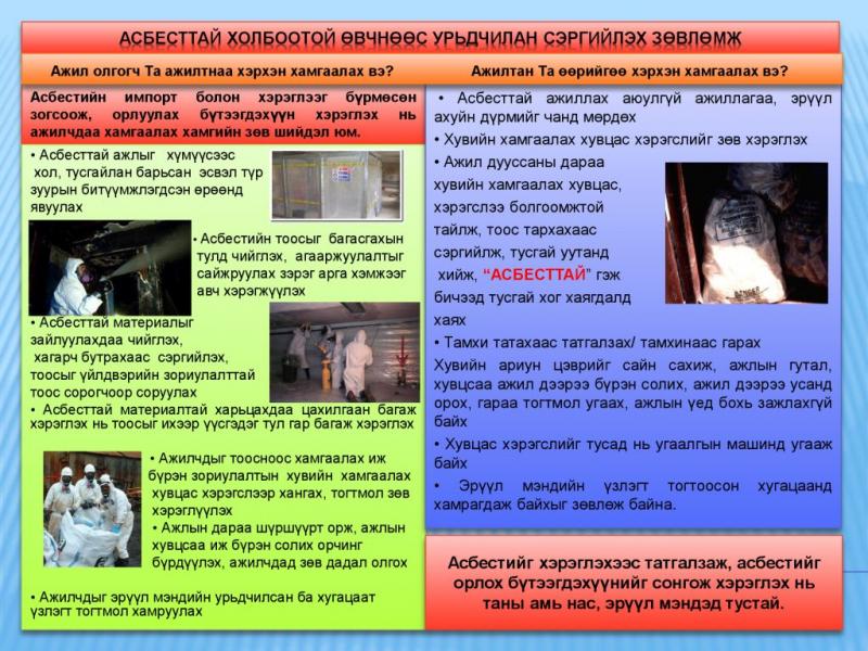 Хөдөлмөрийн аюулгүй байдал, эрүүл мэндийн төв асбесттай харьцан ажилладаг ажилтнуудын бүртгэл мэдээлэл, хяналтын тогтолцоог бий болгох, урьдчилан сэргийлэх үйл ажиллагаа, аюулгүй ажиллагааны заавар, зөвлөмж, асбесттай холбоотой өвчний тохиолдол, эрүүл мэндэд үзүүлэх нөлөөллийг бууруулах зорилготой сургалт хэлэлцүүлгийг энэ сарын 29-нд буюу маргааш зохион байгуулах гэж байна.