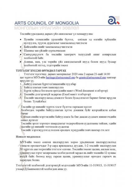 Түүнчлэн төслийн саналыг ирэх сарын 21-ний 14:00 цаг хүртэл МУЗ-ийн heritage@artscouncil.mn ба grants@artscouncil.mn хаягаар хүлээн авах юм байна.