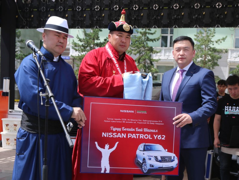 Тулгар төрийн 2229, Их Монгол Улсын 814, Ардын хувьсгалын 99 жилийн ой, Үндэсний их баяр наадмын хүчит бөхийн барилдаанд түрүүлсэн Монгол Улсын 25 дахь аварга П.Бүрэнтөгсөд өнөөдөр “Моннис моторс” компани Nissan Patrol Y62 автомашиныг гардуулан өглөө.