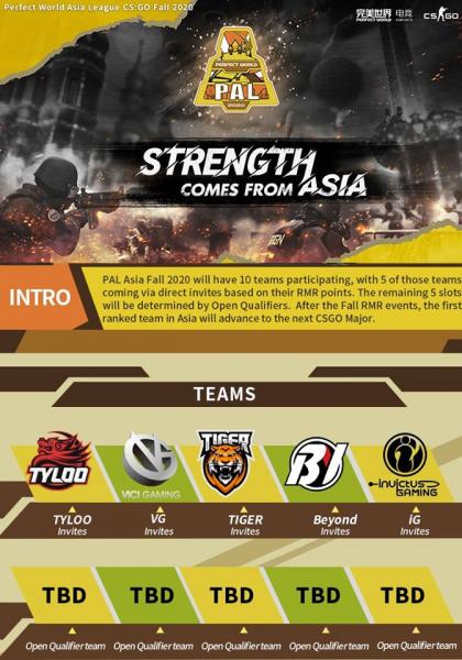 Цахим спортын “CSGO” тоглоомын Perfect World Asia League | Fall 2020 тэмцээний мэдээлэл цацагдлаа. Энэ тэмцээнд нийт 10 баг оролцох бөгөөд RMR онооноос хамаарч байна. Харин бусад баг нээлттэй шалгаруулалтаас эрхээ авна.