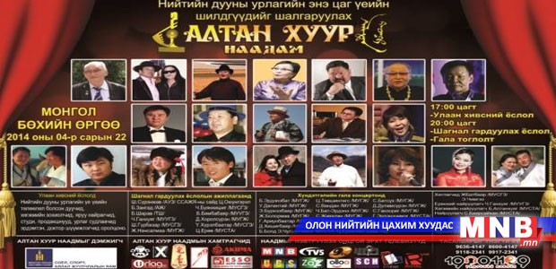 Нийтийн дууны урлагийн энэ цаг үеийн шилдгүүдийг тодруулах “Алтан хуур-2014” наадмын улаан хивсний ёслол, шагнал гардуулах ёслолын ажиллагаа, гала концерт энэ сарын 22-нд Монгол бөхийн өргөөнд болно.