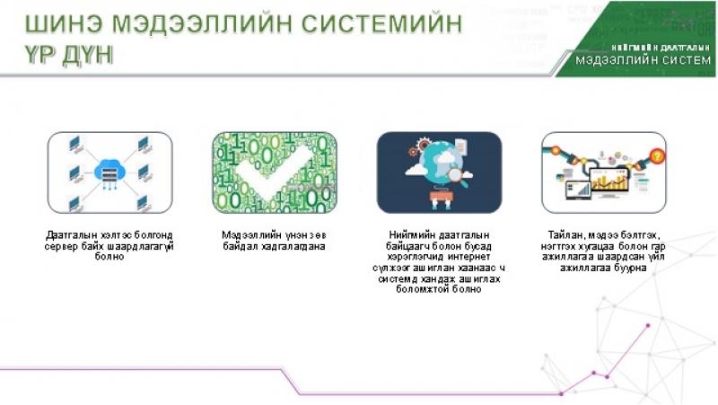Ташрамд дуулгахад, дээрх ажлын үр дүнд нийгмийн даатгалын бүх үйлчилгээг вэб портал болон мобайлаар автоматжуулж авах боломжтой. Нөгөө талаас иргэдэд тохиолддог тэтгэмж авахын тулд цаг заваа үрэх, хамрагдаж чадалгүй хүртээмжээс хоцрох, нийгмийн даатгалын шимтгэл төлөх итгэл алдрах гэх мэт асуудал шийдэгдэж, төрийн үйлчилгээ хурдтай хүрнэ.