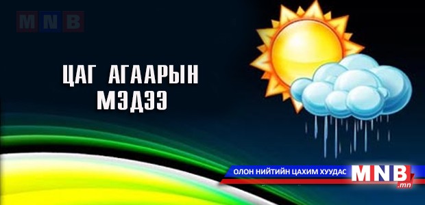 ТӨВИЙН АЙМГУУДЫН НУТГААР: Үүлшинэ. Нутгийн баруун хэсгээр хур тунадас орно. Салхи баруун өмнөөс секундэд 6-11 метр. өдөртөө зарим газраар секундэд 12-14 метр хүрч шороон шуурга шуурна. Хөвсгөлийн уулархаг нутгаар 6-11 хэм, Орхон, Сэлэнгэ, Туул голын саваар 18-23 хэм, бусад нутгаар 13-18 хэм дулаан байна.
