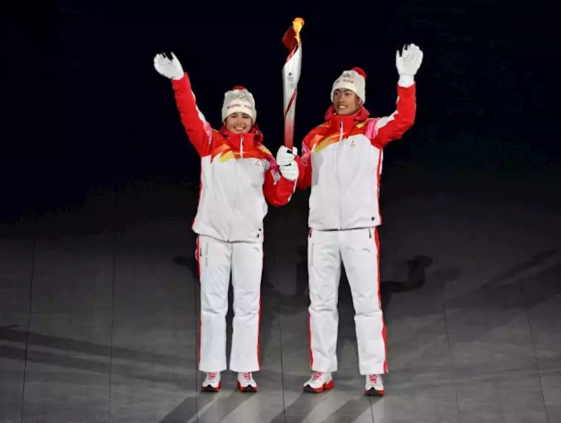Шинжаан-Уйгар гаралтай Хятадын гүйлтийн цанын тамирчин Динигээр Йиламужианг нь Хан үндэстний олонхийн бүлгийн эрэгтэй тамирчинтай зэрэгцэн олимпын галыг асаасан юм.