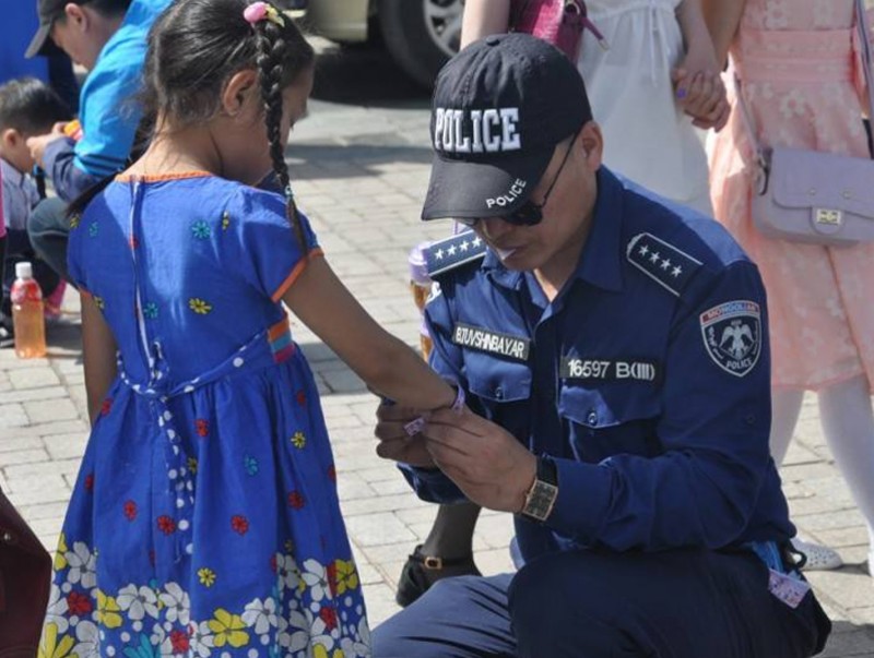 | Бага насны хүүхэд төөрөхөөс сэргийлж гарт нь тууз зүүж байна | ||