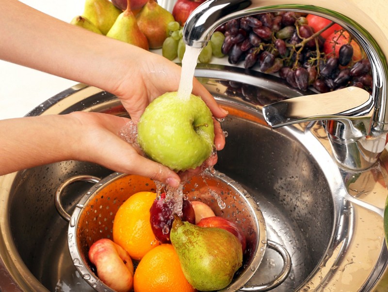 3. Жимс, ногоогоо цоргоор гоожих бүлээн усаар угааж цэвэрлэнэ. Энэ аргыг бас өөрөөр ашиглаж болно. Уусмалаа шүршдэг саванд хийж ногоо, жимсээ шүршээд 10 минут байлгана. Дараа нь урсгал усаар жимс, ногоогоо угаагаарай.
