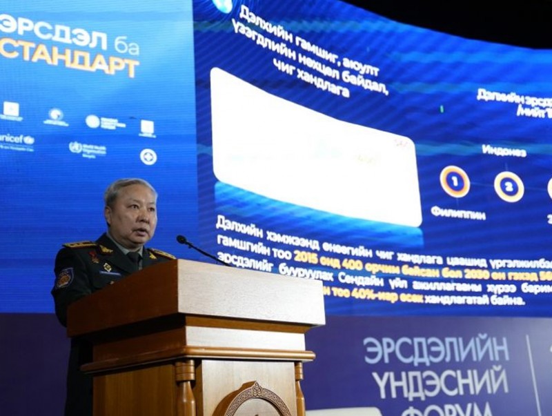 ОБЕГ-ын дарга, хошууч генерал Г.Ариунбуян “Гамшгийн эрсдэлийн өсөлт” илтгэлийг Эрсдэлийн үндэсний форумын үеэр танилцууллаа.
