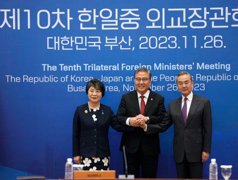 БНХАУ-ын гадаад хэргийн сайд Ван И, Өмнөд Солонгосын гадаад хэргийн сайд Пак Жин, Японы гадаад хэргийн сайд Камикава Ёко нар цаг хагасын хугацаанд гадаад бодлогын 6 чиглэлд ярилцлаа. Гурван улсын гадаад хэргийн сайд нар хамгийн сүүлд дөрвөн жилийн өмнө буюу 2019 онд уулзаж ярилцаж байсан юм. Тэдний ярилцсан гадаад бодлогын зургаан чиглэл дотор эдийн засаг, худалдаа, технологи, энх тайван, аюулгүй байдлын хамтын ажиллагаа багтаж байв. Мөн саяхан Умард Солонгосын хөөргөсөн цэргийн тагнуулын хиймэл дагуулын талаар асуудал хөндөж ярилцсан байна. БНХАУ-ын зүгээс Солонгосын хойгийг цөмийн зэвсэггүй бүс болгох тал дээр тусалж дэмжихэд бэлэн гэдэг байр суурийг Ван И илэрхийллээ.
