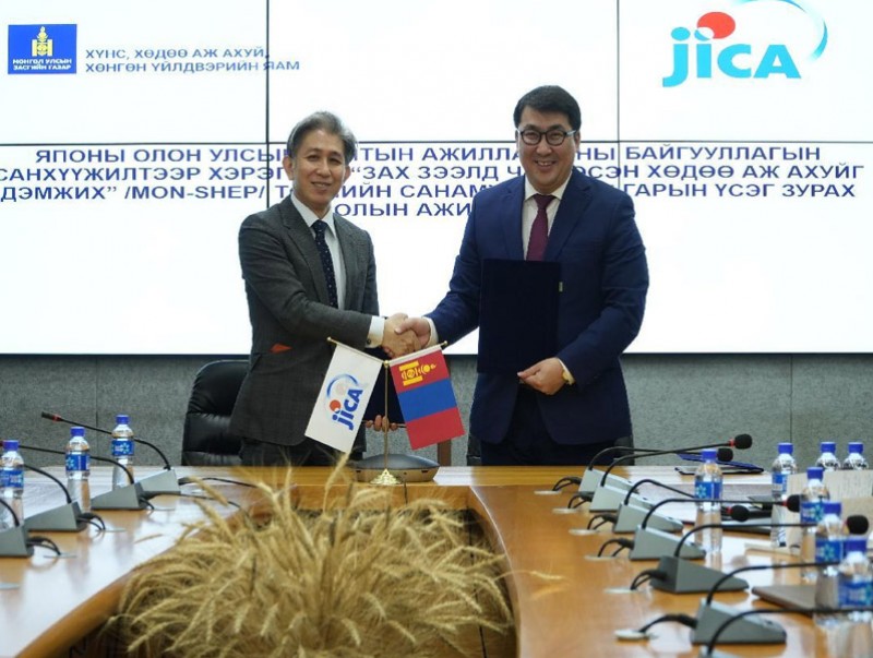Өнөөдөр Хүнс, Хөдөө аж ахуй, хөнгөн үйлдвэрийн яам, Японы Олон Улсын Хамтын Ажиллагааны Байгууллага (ЖАЙКА) "Зах зээлд чиглэсэн Хөдөө аж ахуйг дэмжих MON-SHEP төсөл"-ийг хэрэгжүүлэх баримт бичигт ХХААХҮЯ-ны Төрийн нарийн бичгийн дарга Т.Жамбалцэрэн, ЖАЙКА-ийн Монгол дахь Төлөөлөгчийн газрын дарга Танаки Шиничи нар гарын үсэг зурлаа.