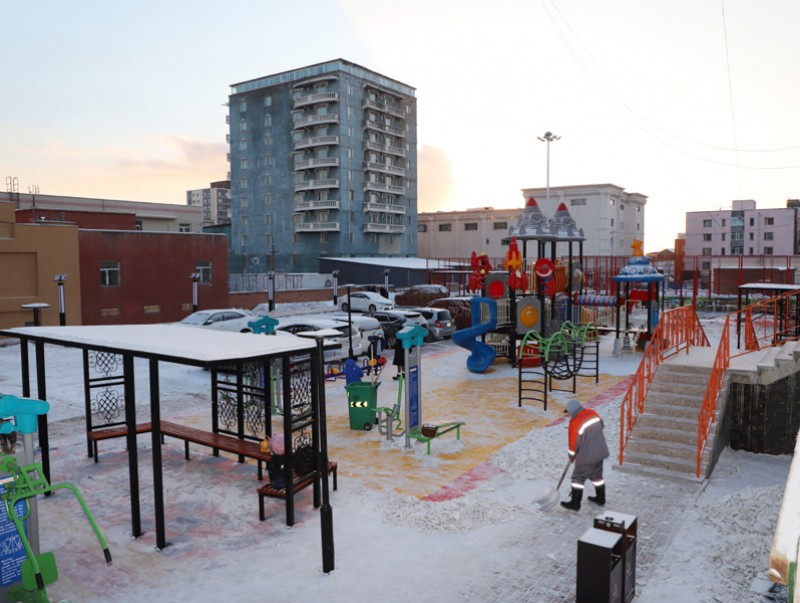 Бүтээн байгуулалтын талбайд авто машины зогсоол, пандус, явган зам, дугуйн зам, спорт талбай, тоглоомын талбай, тайз, гэрэлтүүлэг, чийрэгжүүлэлтийн төхөөрөмж, ногоон байгууламж, сандал сүүдрэвч, хогийн сав байршуулж тохижилтын ажлыг тус тус гүйцэтгээд байна.