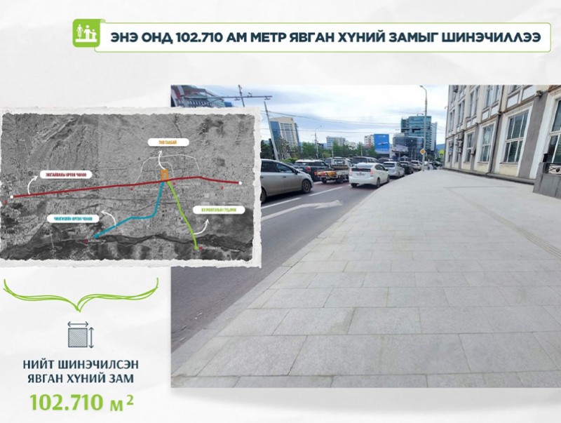2025 онд олон жил шинэчлээгүй нийслэлийн гол гудамж замын явган хүний замыг байгалийн чулуун хавтангаар шинэчилж эхэлсэн. Тодруулбал, энэ онд нийт 15 байршилд 186.701 ам метр талбайг байгалийн чулуун хавтангаар хучихаар төлөвлөсөн. Өнөөдрийн байдлаар 102.710 ам метр талбайг байгалийн чулуун хавтангаар шинэчилж, явган хүний замын ажлыг гүйцэтгээд байна.