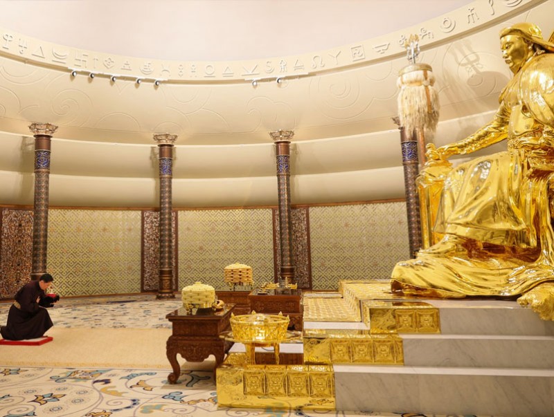 Монгол Улсын Ерөнхийлөгч У.Хүрэлсүхийн санаачилгаар Эзэн Богд Чингис хааны шүтээн, Их цагаан туг, Төрийн хасбуу тамгыг бүтээж, XVII жарны “Элдэв эрдэнэт” хэмээх могой жилийн хаврын тэргүүн сарын бэлгэт сайн өдөр “Чингис хаан” үндэсний музейд байх өргөөнд нь залсан.