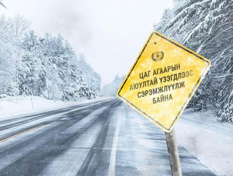 Өнөөдөр /2026.03.02/ ихэнх нутгаар, 03-нд нутгийн зүүн хагаст, 04-нд Халх голын сав газраар цас орж, цасан шуурга шуурч, ихэнх нутгаар хүйтний эрч чангарна. Мөн нутгийн өмнөд хэсгээр хүчтэй салхи шуургатай байх тул зам даваа, гүвээнд харагдах орчин хязгаарлагдаж, халтиргаа гулгаа үүсэхийг онцгойлон анхааруулж байна.