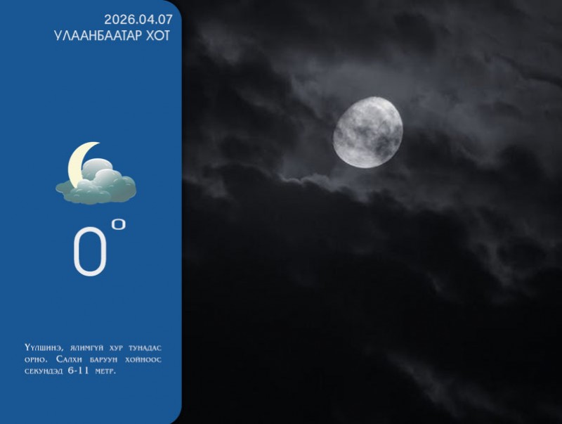 УЛААНБААТАР ХОТ ОРЧМООР: Шөнөдөө үүлшинэ, ялимгүй хур тунадас орно. Өдөртөө үүл багасна, хур тунадас орохгүй. Салхи баруун хойноос секундэд 6-11 метр. Шөнөдөө 0 хэм орчим, өдөртөө 7-9 хэм дулаан байна.