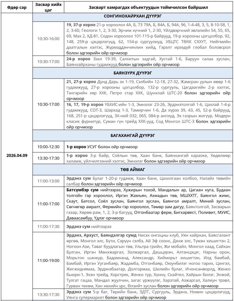 Өнөөдөр буюу 2026 оны дөрөвдүгээр сарын 9-ний Пүрэв гарагт цахилгаан шугам сүлжээнд хийх засварын хуваарийг танилцуулж байна.