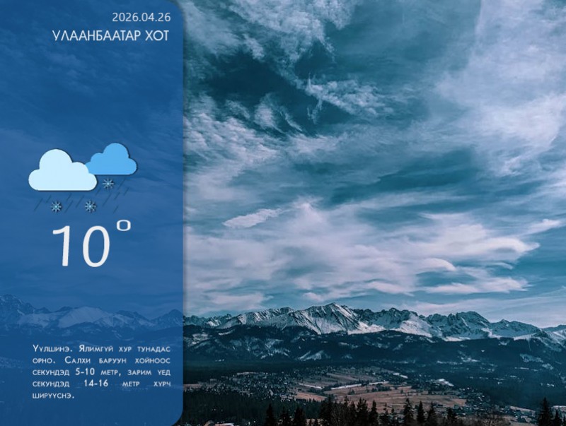 УЛААНБААТАР ХОТ ОРЧМООР: Үүлшинэ. Ялимгүй хур тунадас орно. Салхи баруун хойноос секундэд 5-10 метр, зарим үед секундэд 14-16 метр хүрч ширүүснэ. 8-10 хэм дулаан байна.