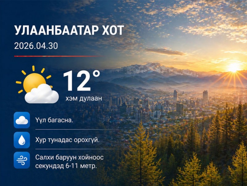 2026 оны дөрөвдүгээр сарын 30-ны 08 цагаас 20 цаг хүртэл: Ихэнх нутгаар солигдмол үүлтэй. Баруун аймгуудын нутгийн өмнөд, төвийн аймгуудын нутгийн баруун өмнөд хэсгээр бороо, нойтон цас, цас орж, цасан шуурга шуурна. Бусад нутгаар хур тунадас орохгүй. Ихэнх нутгаар баруун хойноос секундэд 6-11 метр, говь, тал, хээрийн нутгаар секундэд 14-16 метр хүрч ширүүсэж, шороон шуурга шуурна.