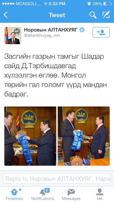 Өнөөдөр Ерөнхий сайд Н.Алтанхуягийг огцруулах асуудлыг УИХ-ын чуулганы нэгдсэн хуралдаанаар хэлэлцэж, дэмжсэн билээ. Тэрбээр чуулганы хуралдааны дараа өөрийн твиттэр хуудсаараа энэ талаараа жиргэсэн юм. Жиргээндээ тэрбээр “Засгийн газрын тамгыг Шадар сайд Д.Тэрбишдагвад хүлээлгэн өглөө. Монгол төрийн гал голомт үүрд мандан бадраг” гэсэн байна.
