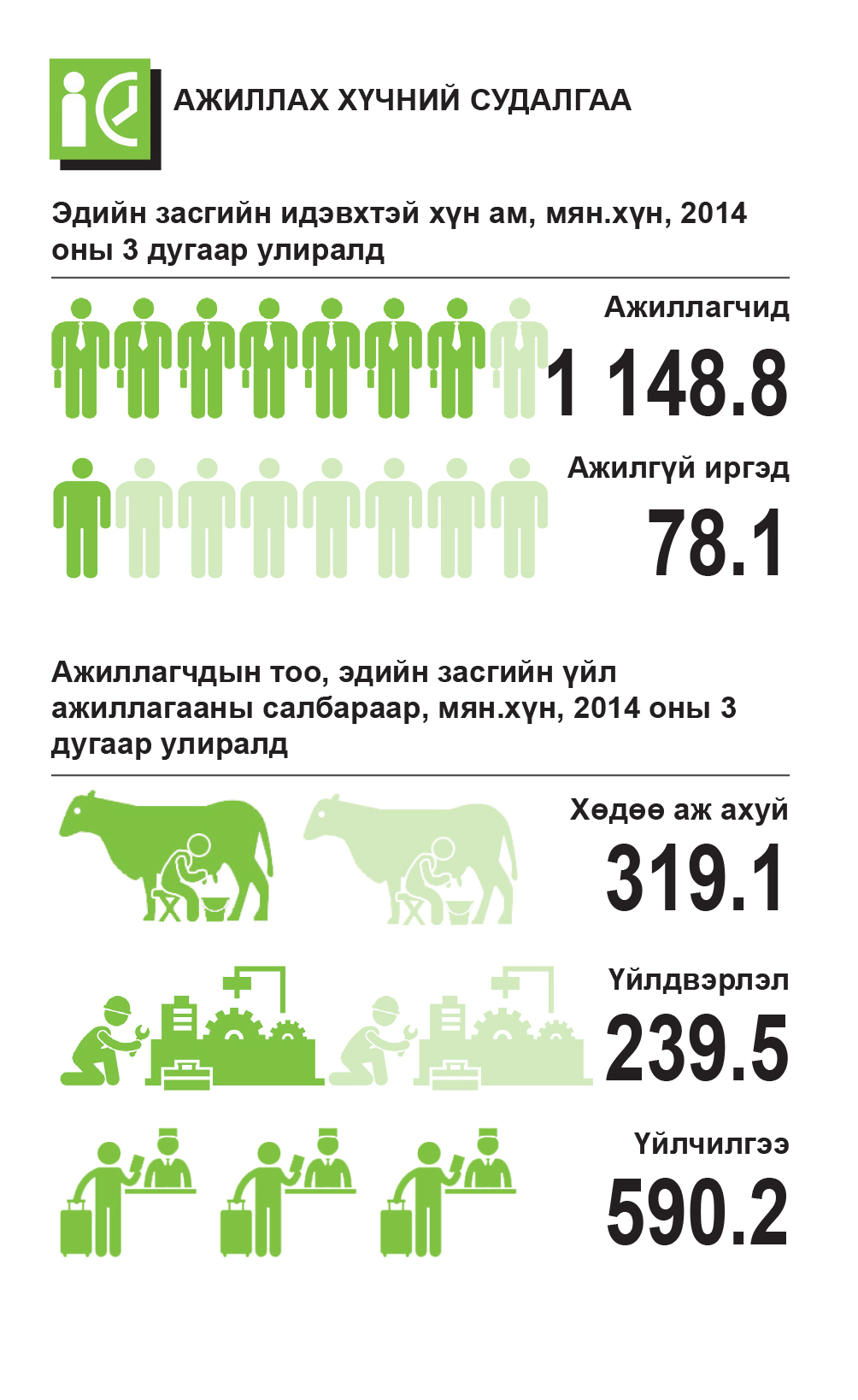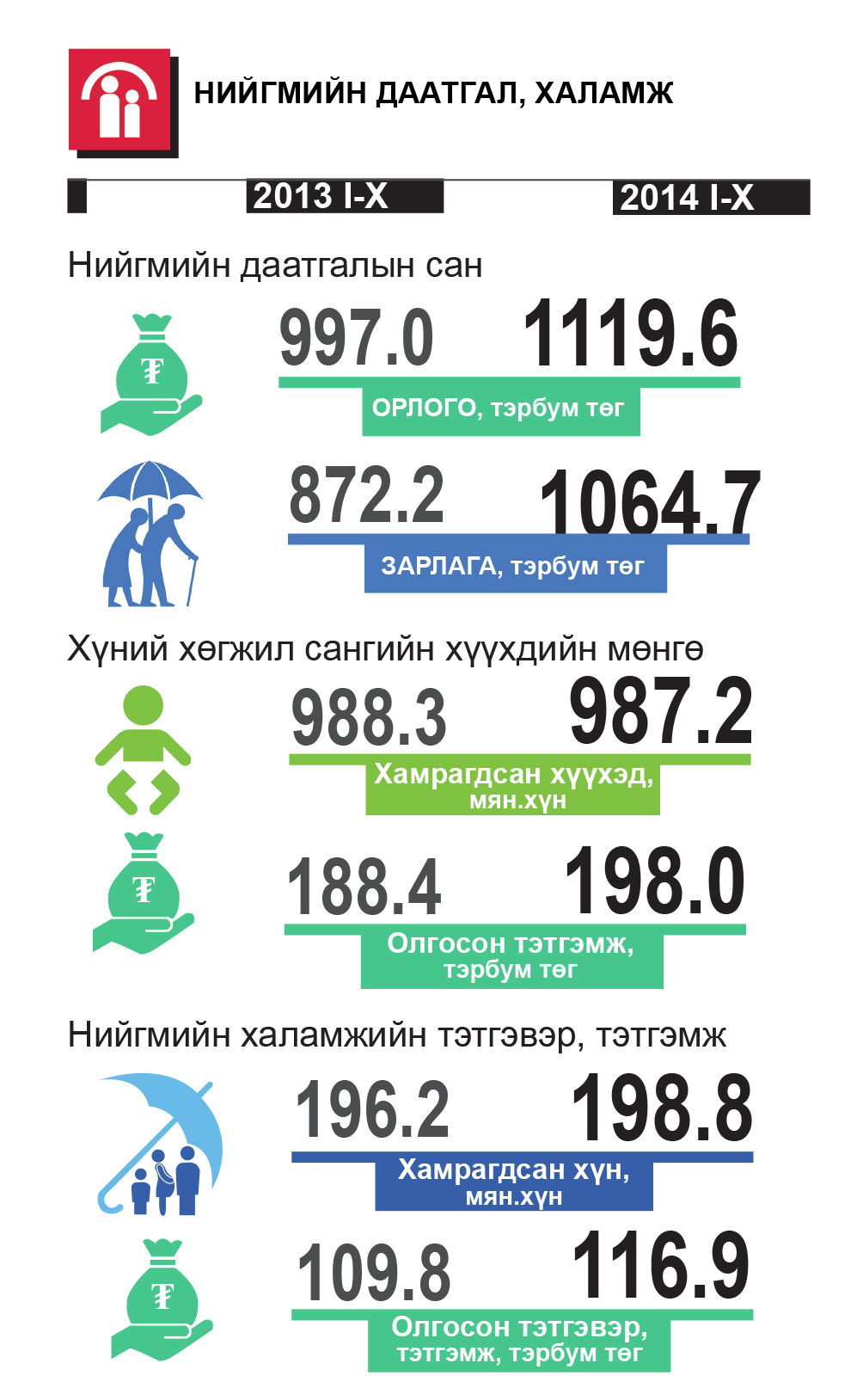 Монгол Улсын нийгэм, эдийн засгийн энэ оны эхний 10 сарын мэдээллийг Үндэсний статитикийн хорооноос гаргажээ. Тоон үзүүлэлтүүдээс харахад улсын хэмжээнд эхний арван сард төрсөн хүүхдүүдийн тоо өмнөх оноос 3.2 хувиар өссөн байна. Түүнчлэн ажилгүйдлийн хэмжээ болоод өрхийн орлого, зарлага хэр өөрчлөгдснийг зурган файлаар дэлгэрэнгүй үзүүллээ.