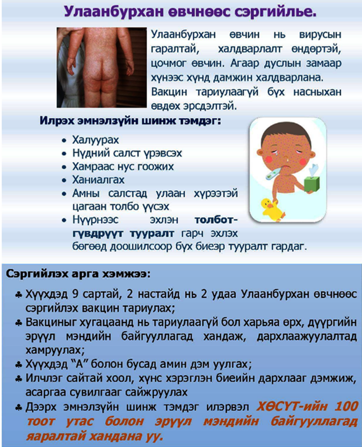 Улаан бурхан өвчний сэжигтэй тохиолдол нийслэлд 81 бүртгэгдээд байна. Иймээс Улаан бурхан өвчин нэмэгдэх хандлагатай байгаа тул нийслэлийн Эрүүл мэндийн газраас дараах сэрэмжлүүлгийг хүргэж байна. Үүнд: