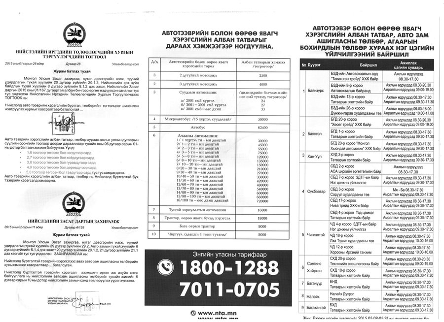 -Авто тээврийн болон өөрөө явагч хэрэгслийн албан тавар, агаарын бохирдол, автозам ашигласны төлбөр хураах ажил хуулиараа тухайн жилийнхээ зургаадугаар сарын 01-ний дотор явагдах ёстой. Энэ жил НИТХ-ын тогтоол, нийслэлийн Засаг даргын 143 дугаар захирамжийн дагуу хоёрдугаар сараас эхэлж авто тээврийн хэрэгслийн татвар хураалтын ажлыг эхлүүлсэн. Одоогоор Улаанбаатар хотод бүртгэлтэй нийт тээврийн хэрэгслийн 65 хувь нь албан татвараа төлсөн. Тэгэхээр хуулиар тогтоосон хугацаа нь дуусах гэж байгаа учраас татвар хураалтын ажилдаа идэвхитэй оролцохыг уриалж байна.