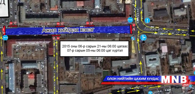 Зам засвар, шугам хоолой солих ажлыг төлөвлөгөөний дагуу 2015 оны зургаадугаар сарын 07 ны өдрөөс эхлэн 2015 оны наймдугаар сарын 16-ны өдөр хүртэл Энхтайвны өргөн чөлөөний Төв шуудангийн уулзвараас баруун 4 замын уулзвар хүртэлх замыг 3 үе шаттайгаар хааж гүйцэтгэнэ.
