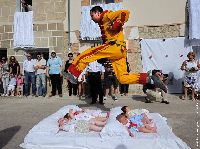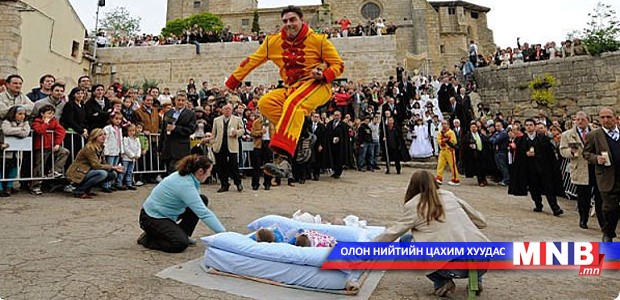 Испанид болдог католик шашны нэгэн баяр үзэгч, сонирхогч, жуулчдыг маш ихээр цочирдуулдаг гэнэ. Насанд хүрсэн залуус дөнгөж төрсөн нярай хүүхдийн дээгүүр харайх аж. Мэдээж, ээжээс нь зөвшөөрөл авна. Үргэлж л болдог юманд хүн дөжирдөг хойно нутгийн хүмүүс энэ зан үйлийг нэг их ойшоодоггүй байна. Нэг үе рок-н-роллын хаан гэгдэж явсан Элвисийн хувцастай төстэй зүйл өмссөн залуус нялх хүүхдийн дээгүүр хайх нь үнэхээр аймшигтай.