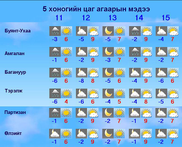 | Нийслэлийн цаг агаарын 5 хоногийн урьдчилсан мэдээ | ||