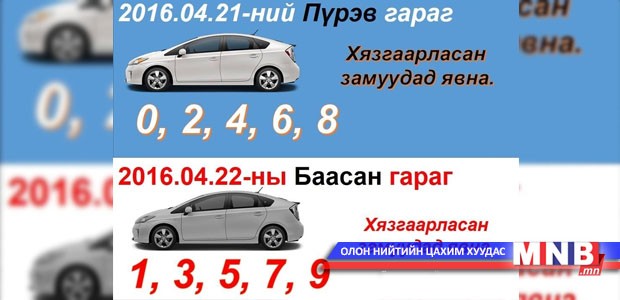 Маргааш буюу 4 дүгээр сарын 21-ний пүрэв гарагт тэгш тогоор төгссөн дугаартай тээврийн хэрэгсэл, баасан гарагт сондгой тоогоор төгссөн тээврийн хэрэгсэл замын хөдөлгөөнд оролцоно.