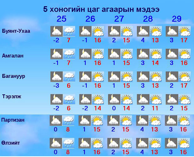| Нийслэлийн цаг агаарын 7 хоногийн урьдчилсан мэдээ | ||