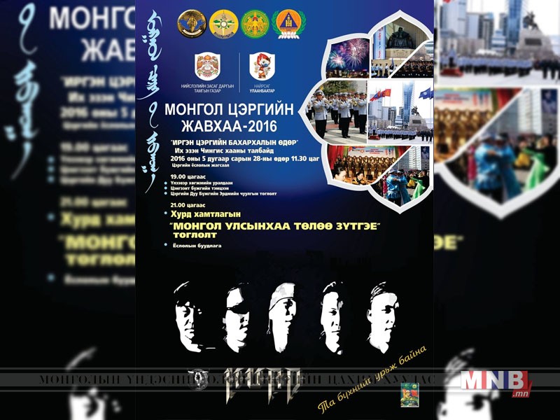Нийслэлийн Засаг даргын санаачилгаар дөрөв дэх жилдээ зохион байгуулж байгаа “Монгол цэргийн жавхаа-2016” уралдааны эцсийн шалгаруулалт, шалгарсан ангиуд оролцсон үзүүлэх тоглолт, шагнал гардуулах ёслолын ажиллагаа 05 сарын 28 буюу бямба гарагт Чингисийн талбайд болно.