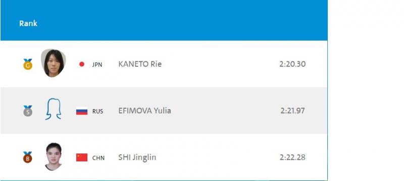 Эмэгтэйчүүдийн 200 метрийн мэлхий сэлэлтийн алтан медалийг Япон улсын тамирчин Кането Рай хүртлээ. Дэлхийн аваргын мөнгөн медальтай Рай анхны олимпоосоо алтан медаль авч хувийн амжилтаа ахиулж чадсан юм. Японы тамирчин Кането Рай 2.20.30 дойлын амжилт үзүүлэн нэгдүгээр байрт орсон бол ОХУ-ын тамирчин Юлия Эфимова 2.21.97 дойлоор удаалж хоёрдугаар байрт бичигдлээ. Харин гуравдугаар байрыг Хятад улсын тамирчин Ши Жин Лин эзэлсэн. Тэрбээр 2.22.28 дойлын амжилтаар барианд орж, хүрэл медалийн эзэн боллоо.