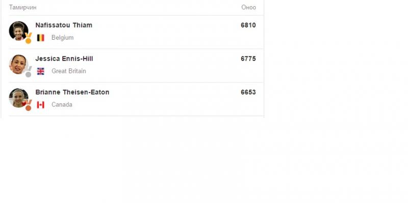 Хүрэл медалийн эзнээр Канадын тамирчин Бранна Тэйсэн Этон /Brianne Theisen Eaton/ 6653 оноо авч гуравдугаар байрт бичигдэж байна.