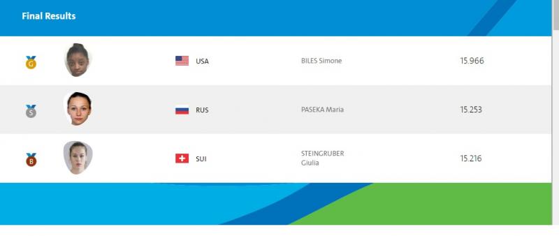 Дэлхийн аваргын 10 алтан медальтай Саймон Риогийн олимпоос гурав дахь алтан медалиа авч, гайхамшгийг үзүүлж байна. Тэрбээр 15.966 оноог авч тэргүүн байрт орсон бол мөнгөн медалийг ОХУ-ын тамирчин Мария Пасека 15.253 оноогоор хүртлээ. Мария Лондоны олимпоос багийн төрөлд мөнгөн медаль авч байжээ. Энэ удаад ганцаарчилсан төрлөөс мөнгөн медаль хүртсэн нь том амжилт боллоо.