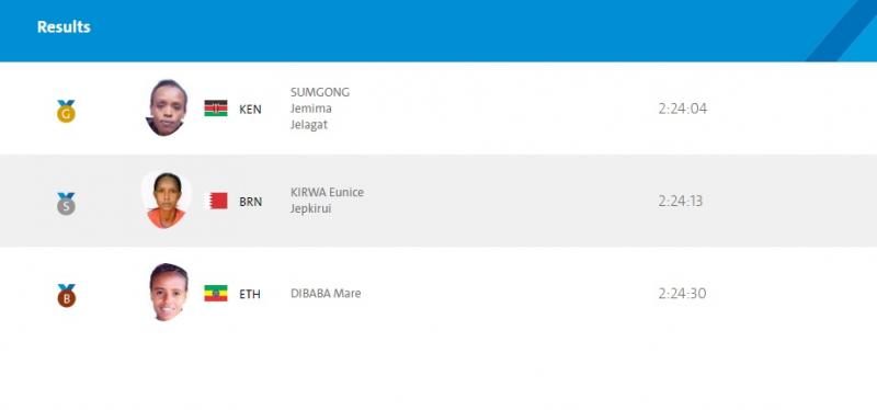Гуравдугаар байрт дэлхийн аваргын алтан медальтай Этиопын тамирчин Маре Дибаба барианд орсон. Тэрбээр 2 цаг 24 минут 30 секундын амжилтаар хүрэл медалийн эзэн болж байна.