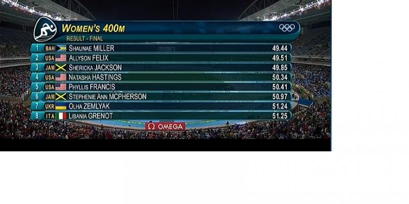 Финалын уралдаанд олимп, дэлхийн аваргууд хоорондоо өрсөлдөж шилдгээ тодруулав. Барианд олимп, дэлхийн аварга Аллисон Феликс, Бахамын тамирчин дэлхийн аваргын мөнгөн медальт Шауне Миллер нар ойрхон орж ирсэн юм. Гэвч цагийн үзүүлэлтээр Шауне Миллер 49.44 секундээр нэгдүгээр байрт орж олимпийн алтан медаль хүртлээ. Харин Аллисон Феликс 49.51 цагийн үзүүлэлтээр хоёрдугаар байрт орж олимпийн мөнгөн медальтан болов. Гуравдугаар байрыг Ямайкийн тамирчин Шерика Жэксон эзэлсэн. Тэрбээр 49.85 цагийн үзүүлэлтээр хүрэл медалийн болзол хангалаа.