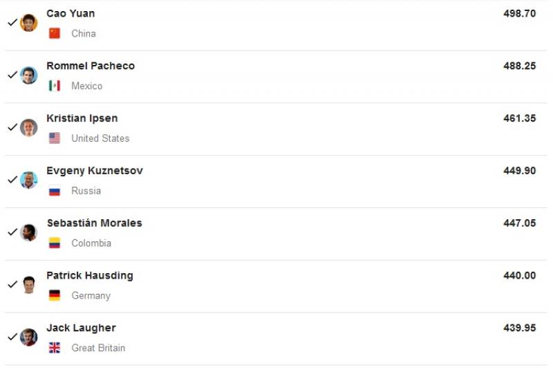 Ингээд хагас урьдчилсан шатанд БНХАУ-ын тамирчин Као Юан 498.70 оноогоор нэгдүгээр байрт орж хагас шигшээд өрсөлдөх эрхтэй болсон. Тэрбээр 2015 оны дэлхийн аваргын алтан медальтай, мөн энэ жил Риогийн олимпоос 3 метрийн хосын төрөлд хүрэл медаль хүртсэн тамирчин юм. Мексикийн тамирчин Роммел Пачеко 488.25 оноогоор хоёрдугаарт бичигдлээ. Харин гуравдугаарт АНУ-ын тамирчин Кристиан Ипсен 461.35 оноогоор дараагийн шатанд шалгарч үлдэв. Хагас шигшээд 18 тамирчин өрсөлдөх бол финалын тэмцээнд 12 тамирчин үлдэж алт, мөнгө, хүрэл медалийн эзэд тодорно.