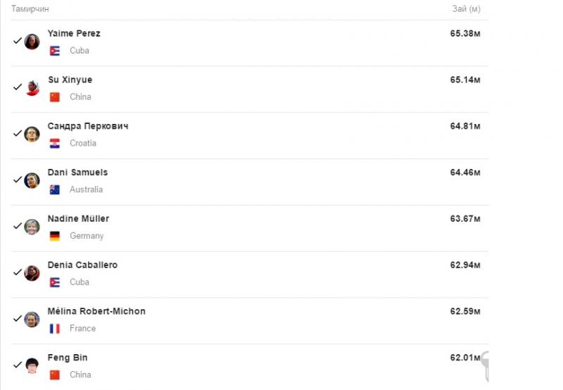 Финалд үлдсэн тамирчдаас одоогийн байдлаар хамгийн хол зайд Кубын тамирчин Перез Яайме шидэж, 65.38 метрээр тэргүүлж байна. Тэгвэл БНХАУ-ын тамирчин Су Шинюү 65.14 метрээр удаалж байна. Харин Хорватын тамирчин олимп, дэлхийн аварга Сандра Перкович 64.81 үзүүлэлтээр гуравдугаарт бичигдээд байгаа юм. Түүний хувийн дээд амжилт нь 71 метр байдаг. "Рио-2016" олимпийн наадамд Сандра өөрийн дээд амжилтаа эвдэж чадах эсэхийг финалын тоглолтоос үзэх боломжтой.